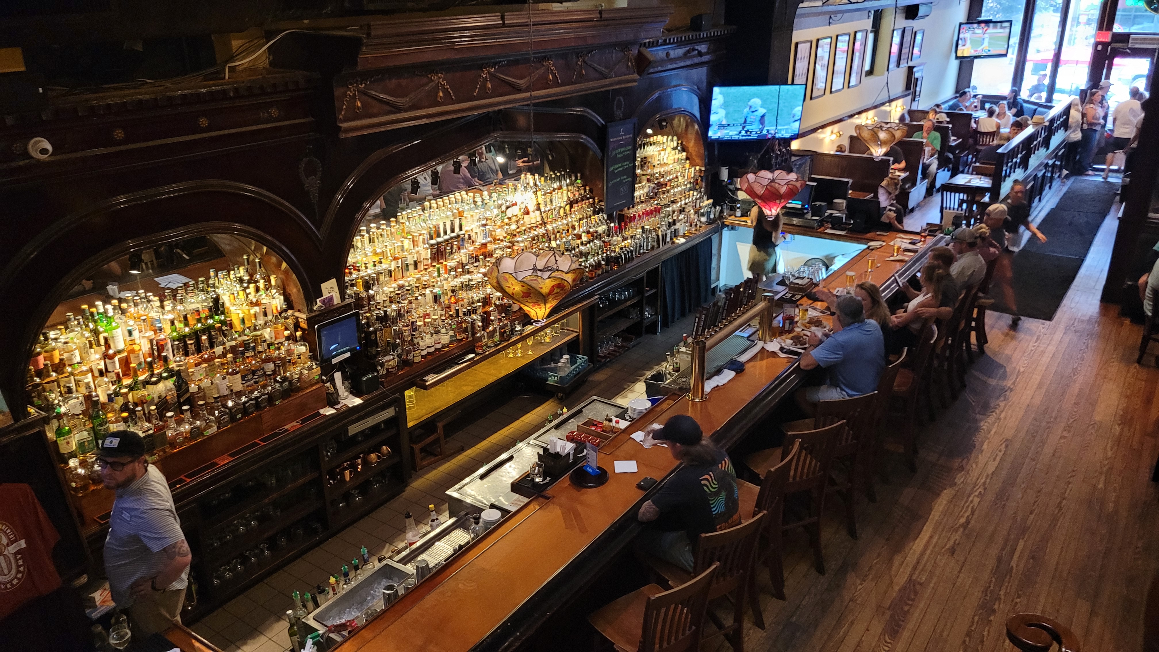 Located at 9 North Front Street, an historic Wilmington building, Front Street Brewing has been brewing since 1995. With 14 house brews on tap, there is something for everyone. Front Street is also a top notch restaurant. I visited on a rainy day and was glad to walk into a warm inviting environment. looking at the beer selection, I had to have the Dram Tree Scottish Ale. Dark, malty with notes of mocha, semi sweet and dark fruits it was excellent. I'll go to the dark side anytime for a brew this tasty. At 7.2% ABV the tastes stand out and I was happy to find the style as not many breweries make it. The Black and Bleu smash burger was very good and paired well with the Port City IPA, their best selling brew. Tastes of citrus, piney and smooth finish, it stood up to the strong tastes of the blue cheese, bacon and blacking seasoning. Overall a great lunch and we will return. I got this overview of the entire lower floor area from above. Website: FrontStreetBrewery.com